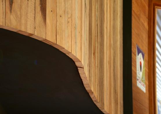 Blackbutt floorboards at 140 wide are used throughout the home, with the boards wrapping up the walls and onto the roof to serve as lining as well. The large profile of the boards gives the rustic atmosphere of the home, which has a soft ambience from the imperfect personality of the timber.