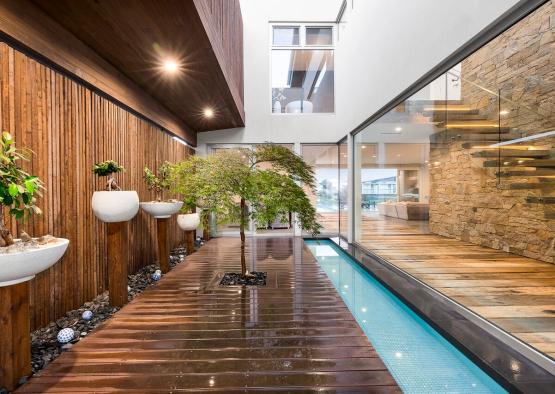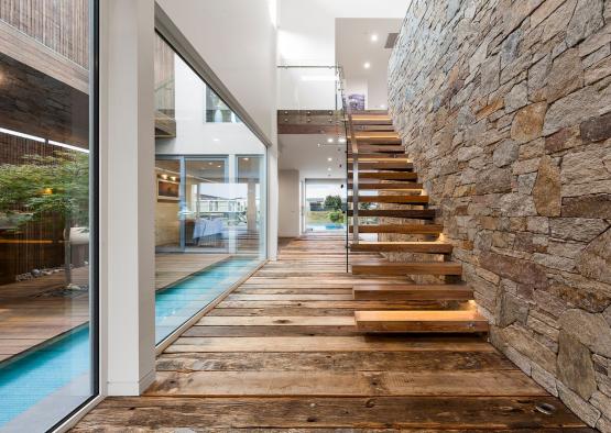 The resulting design was inspired by Asian minimalism, creating textures and patterns with natural materials such as huge recycled pier timbers, rustic stone and smooth rendered walls. The balance of huge recycled timber pylons from the Morning pier with fresh faced new timbers creates a dynamic aesthetic that links outdoor to indoor seamlessly, creating an uninterrupted path from the street into the house, and continuing into the courtyard.