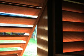 Three of the buildings, have fixed louvred shutters, which open outwards on a top pivot point. These shutters were designed in collaboration with the carpenters, with prototypes being mocked up to allow for the most efficient use of timber. This also provided an opportunity for refinement of the design, ensure the joints were notched in way to maximise strength, and to ensure that the angle of the louvres dealt with privacy and natural light issues.