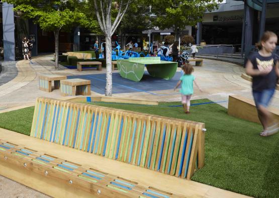 Forming the foundations of this project, timber has been used in a series of imaginative and playful ways to create this space. The efficient use of timber has allowed the regeneration of an underutilised space into a colourful, contemporary and active town square setting which has exceeded the clients brief in relation to the activation of the space.