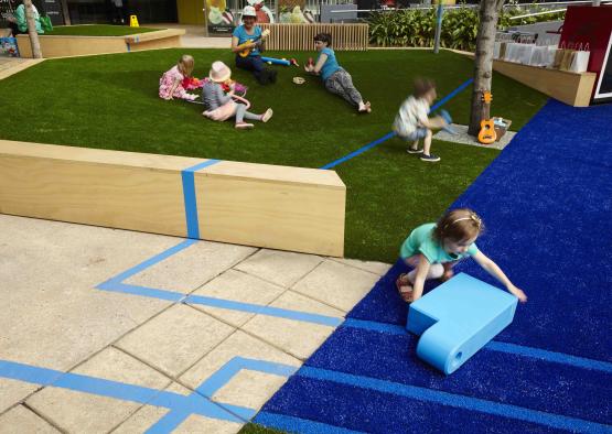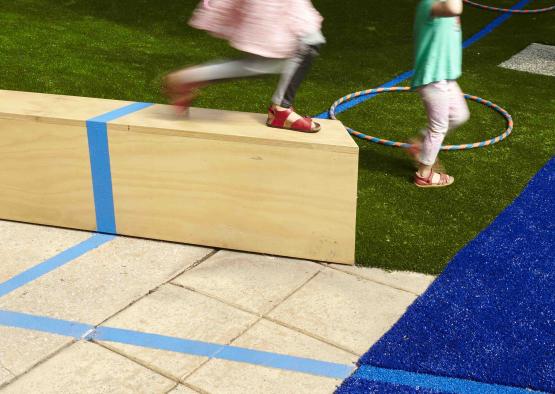 The raised timber plinths are arranged to provide a central play area framed by sloped lawn terraces for passive recreation. Timber was used as the final finish of the raised plinths as well as the structural framework. The plinths then had synthetic turf applied leaving an exposed timber seating edge. The raised timber plinths where easily installed by the builder and they transformed the space to facilitate various uses, while having a minimal impact on existing surfaces. The use of timber enabled the rejuvenation of this space to happen in just a couple of weeks.