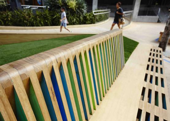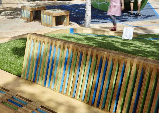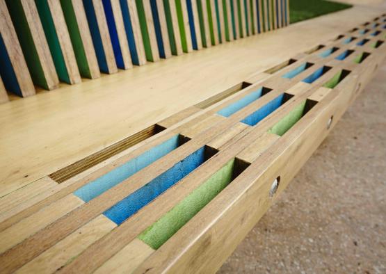 The project was inspired by a laminate construction. The laminated horizontal battens in the seats where painted only on their internal sides to provide a moment of discovery that is only exposed by getting up close or from particular angles. The random application of blues and greens create a unique identity for the pop up park.