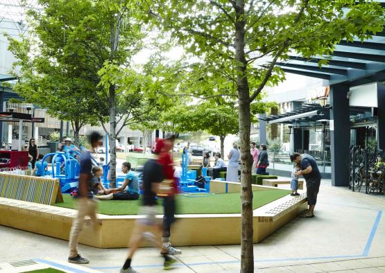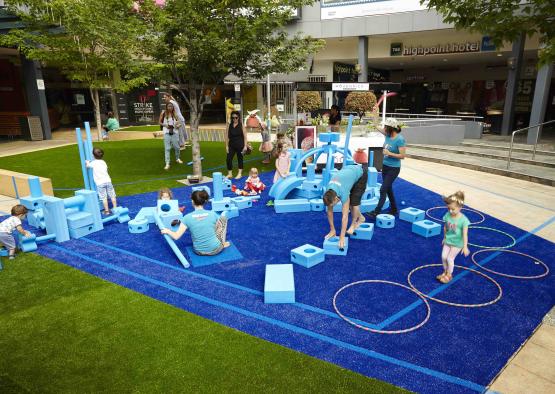 Reimagined as a mini town square, the modest cost "pop up" proposal converted what was merely an access route to the centre into a destination in its own right. Thinking about the space as a town square un-packed a series of design principles which influenced the final outcome for the site. The result is a well thought out composition of circulation, play, relaxation and outdoor dining.