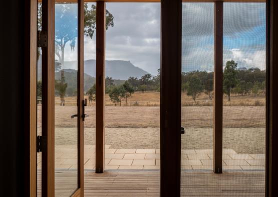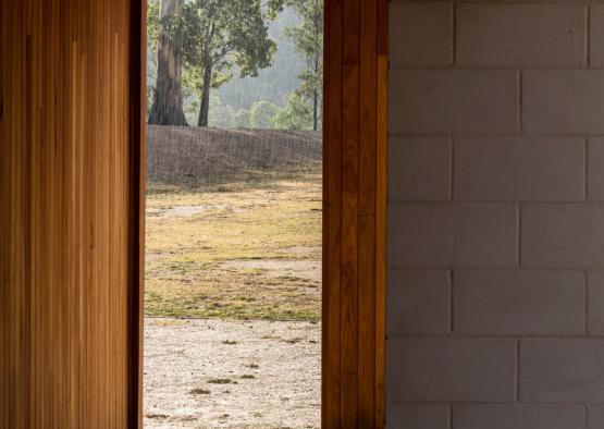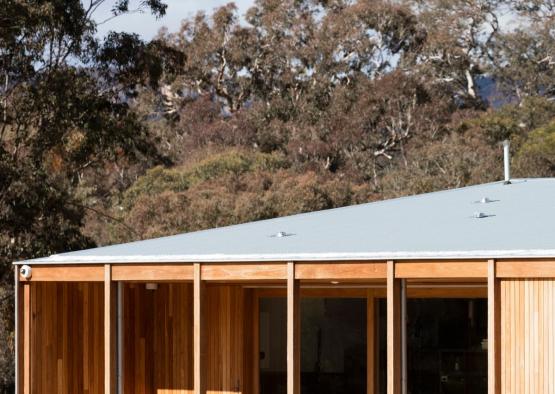 The warm glow of the Silvertop Ash mimics the colours present in the surrounding landscape. Natural ochre, sand and auburn colours create an incredibly soft and welcoming presence for the structure. The distinction between the arid summer grass and the sandstone and timber decking as you enter the structure is almost indistinguishable. Sensitivity to the ecology and natural beauty of the site is paramount in this design.