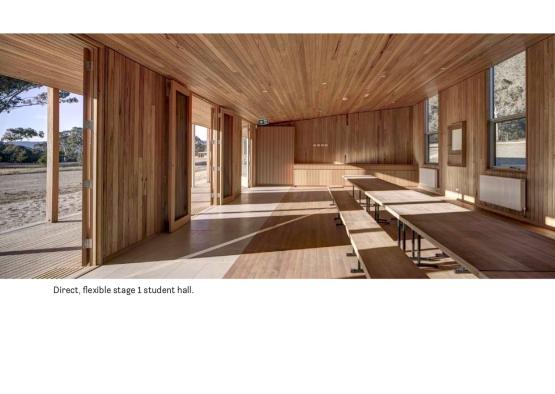 The interior spaces of the school are strikingly modern and referential of country residential spaces. Extensive timber not only provides a uniformly beautiful space, but a visually simple space to minimise distractions from learning. The lightly raked ceiling allows daylight to enter and creates variation to the volume of the room.