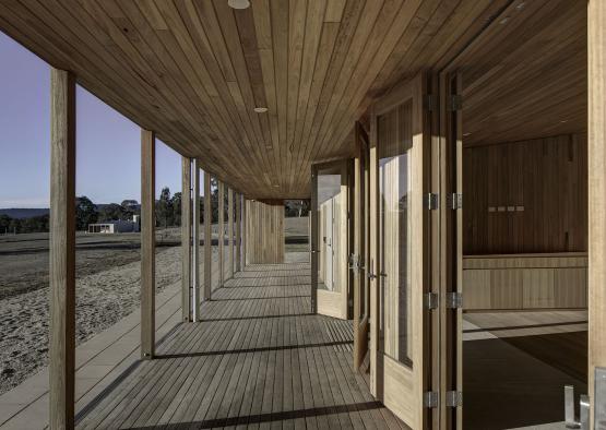 Silvertop ash shiplap profile timber with a matte seal was used for exterior cladding. The durable and locally grown timber was specified for the harsh range of weather conditions the building will experience throughout its life on the exposed site. The shiplap profile caters for expansion and contraction from the changes in humidity and temperature.