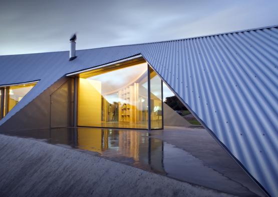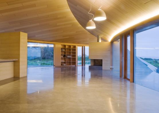 The highly reflective polished concrete maintains a warm glow inside, infusing a homeliness to the often cold material. The timber lined roof adds to this glow by contributing a yellow hue.
