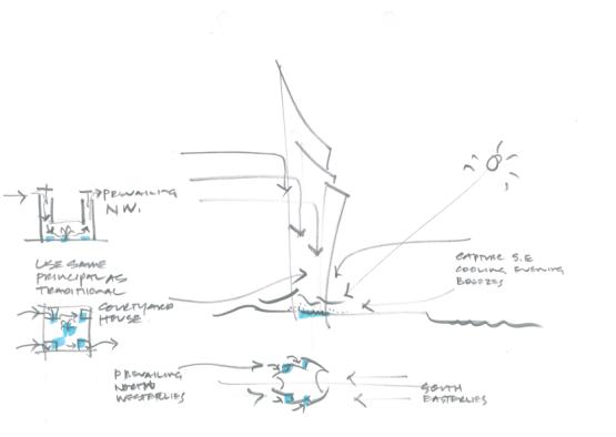 The Timber Canopy shade and cooling structure at the base of the D1 Tower in Dubai was influenced by traditional wind tower technology and passive climate control. The expansive timber sculpture moderates between three contextual scales. The tower itself is an urban landmark and at 80 storeys high is visible from miles around. The scale of the smooth glass skyscraper needed a device at the ground to knit the building into the site and surrounding landscape as well as to create a human scale at the building's edge. Adjacent to a grand bridge over the main waterway of the City the site marks the arrival and departure from the new Cultural precinct. Situated on the edge of the Dubai Creek, D1 occupies the place where the traditional Dhow boats were built. The timber Canopy pays homage to this crafting and curving of wood and is a reminder of the site's place in the City's history. Remnant fishing baskets and nets found in the landscape inspired the original conceptual studies for the final flowing forms.