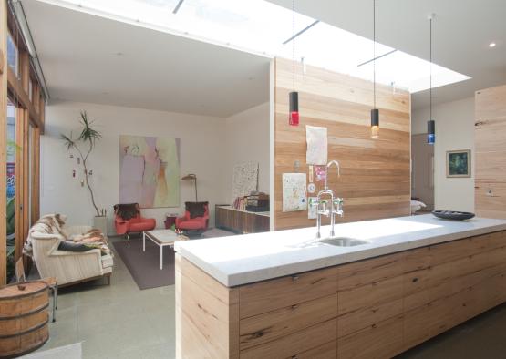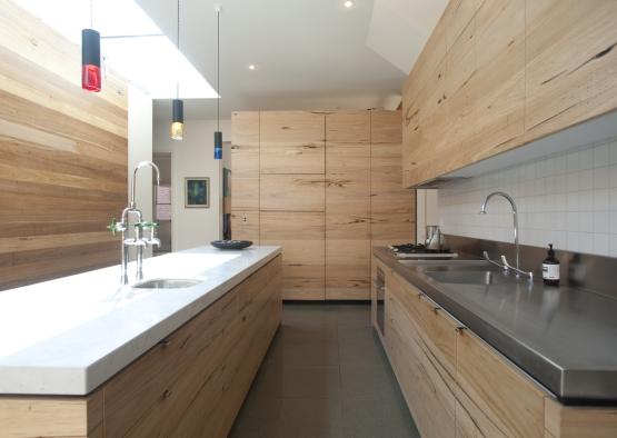 The timber throughout the house comes from recycled sources, and the plywood used for the bathroom, laundry and robe joinery are also from sustainable sources. The Tung Oil finish on the timber floor has no added polyurethanes. All wall and ceiling paints utilise Low VOC bases. Low voltage lighting in addition to five star rated appliances help minimise the amount of electricity consumed.