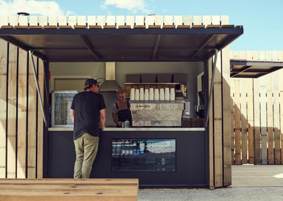 The 12m tall lookout tower comprises two shipping containers standing end-to-end, with timber cladding wrapping the structure to create a cohesive whole. This tower acts as visual signifier for the site, with the timber standing out against the sky as visitors pass by.