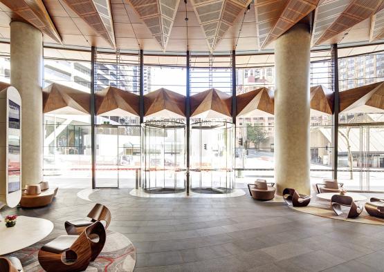 The EY Centre and its innovative use of timber screens in the facade, as well as in the foyer ceiling and in the suspended awning enables the building to appear as a ‘tower of wood’ rising out from the greyness of its neighbours. The EY Centre uses a ‘world-first’ closed cavity facade with a timber blind system. The timber blinds adjust automatically according to the sun’s natural cycles. This progressively adjusting timber screen filters the light into a warm timber glow, resulting in a significant cost and energy saving on heating and cooling of the building. From the outside, the building changes in appearance as the sun moves. A suspended awning of folded timber inspired by the eucalypts at the water’s edge reaches out and shelters the footpath, reflecting light into the lobby interior. The EY Centre is a different type of sustainable city tower: warm, human, and responsive.