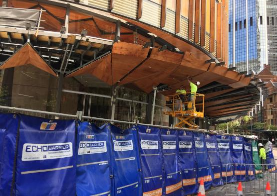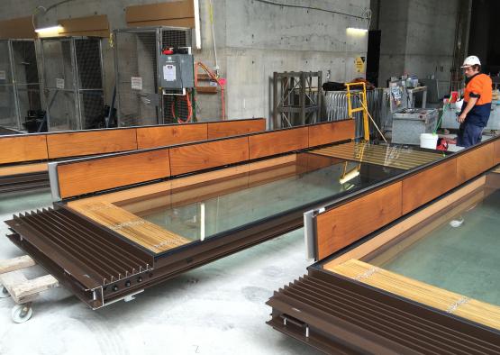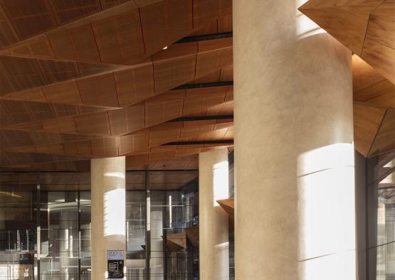 Foyer Awning: The external soffit of the foyer awning uses 260 square metres of marine grade plywood and 230 linear metres of Engineered Laminated Timber