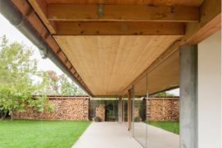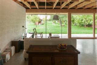 The interior of the house is a story of two spaces. The first is the main living room, flooded with natural light from the large windows that make up the whole wall that faces the garden. The second hovers above the main space; a forest of beams and posts makes up a dim space that has a large window overlooking the garden.