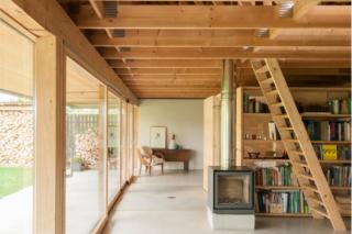 The loft space that sits above the light-filled ground floor is a forest of timber framing, with the structure exposed to anyone who climbs up the ladder. Large windows bring light into what could easily have been a dim, dusty attic, but instead is an intriguing and inventive space, perfectly complementing the not-quite traditional gables of the roof.