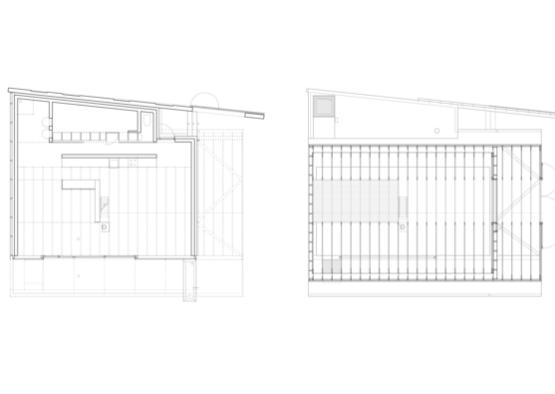 The house presents as a tile covered gable roof, completely hiding the contemporary loft beneath. The ground floor is a free space, open to the south-facing garden, with a simple structure including a sauna and a shelf. Above this first house hovers another, a retreat hidden in the bush of the industrial carpentry, with views that overlook the ground floor or float over the remote landscape.