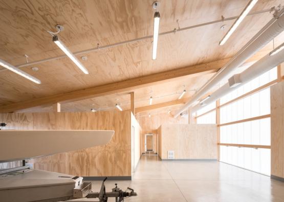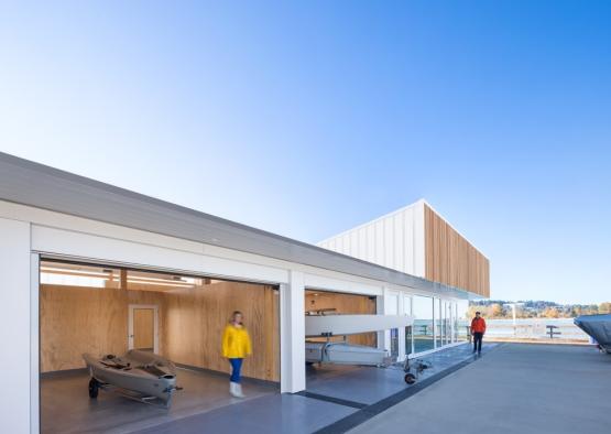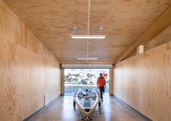 The land facing wedge features a glulam facade completely lined with translucent polycarbonate, which serves to flood the interior with a soft diffused light. The sea facing wedge uses operable garage style doors to open up the facade to the marina bays in the water. The plywood lined boat maintenance bays become the focal point of the facade when the doors are open.