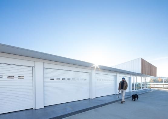 The white coloured metal panels reference the colour of the boats that it services. A knifes edge gutter that protrudes over the garage doors forms a protective overhang and references the form of the racing boats in the marina.