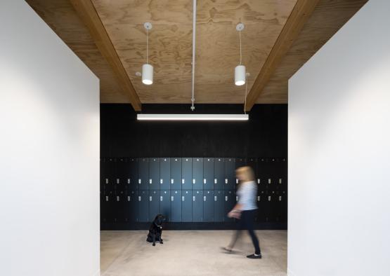 Plywood is the main material used for lining the interior of The Dock. The warmth and durability of plywood were the main considerations for its use. The industrial grade plywood is easily replaced when necessary. The plywood lined false ceiling above the office space acts as an inconspicuous concealment of services and mechanical elements for the doors.