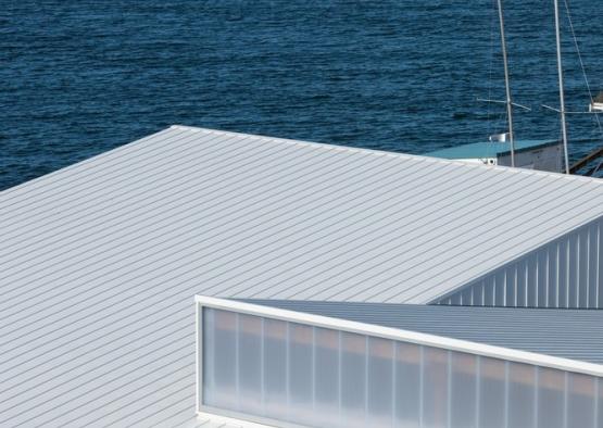 The exterior skin of The Dock features two starkly contrasting materials that balance out the overall aesthetic. The industrial pragmatism of the standing seam metal panels that clad 70% of the exterior are softened by the light glow of the translucent polycarbonate that presents to the land. Timber battens line the upper half of the sea facing wedge, directing the eye line to the doorways and providing a link between exterior and interior palette.