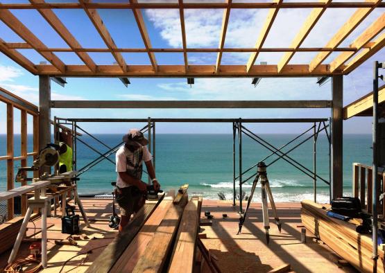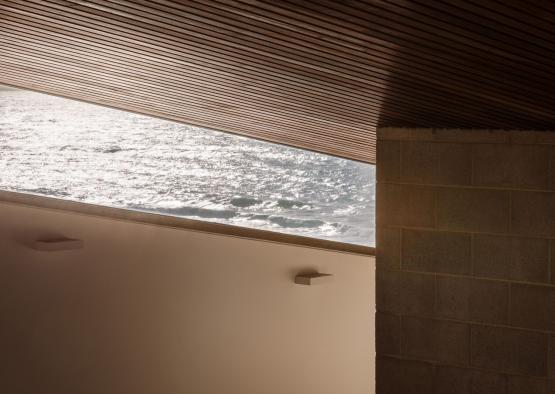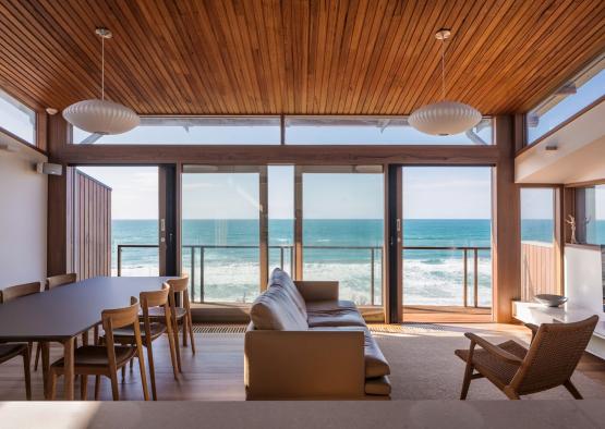 Strategically placed clerestory windows allow light to filter into the tall rooms, bathing the timber roof with light. Eye level windows create frames for the expansive views over the ocean beyond.