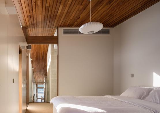 The continuous roof profile and materiality provides a concise link between the rooms in the house. A clear matte finish was used to accentuate the grain of the timber and create a softer feel than the exterior ash.