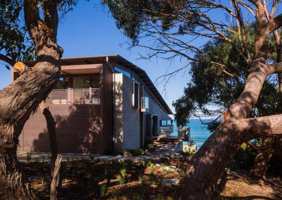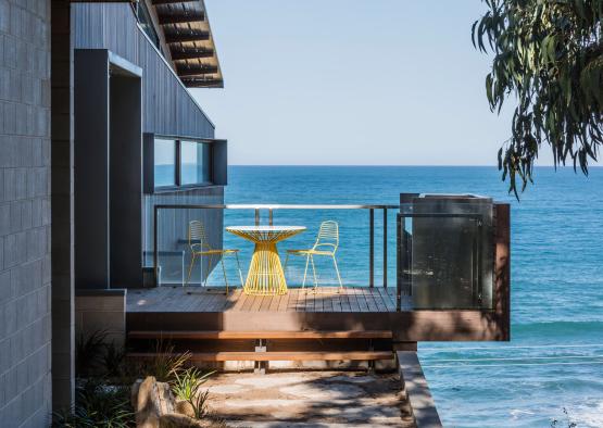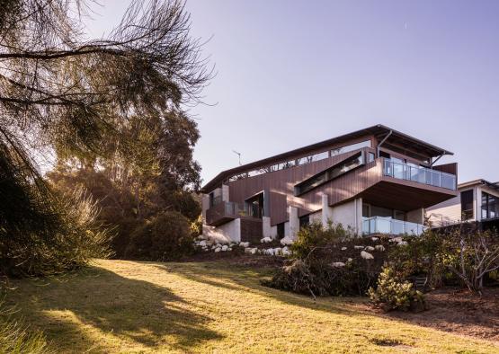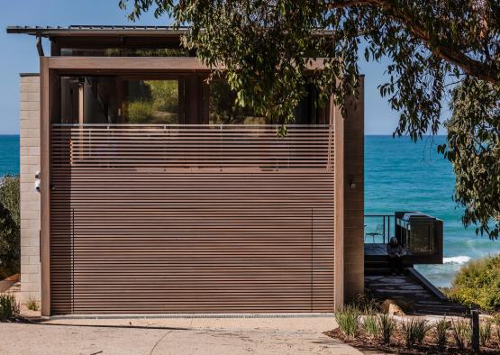 A rugged beach house that soars high above the exposed Lorne coastland.