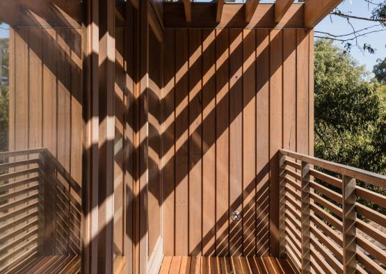 Silvertop ash was specified for its locality and durability. The native timber was used for cladding, decking, battens, balustrades, fascias, and for the elegant tapered roof purlins that are left exposed. The purlins' tapered profile instils a lightness to the roof, offsetting the bulk of the house below. The ash timber was coated with a translucent wood oil to further improve its weather resistance. The natural material blends subtly into the vegetated site, and will harmonise further as the material greys off. A mixture of dressed boards, and battens on plywood were used to create a texture to the facade.