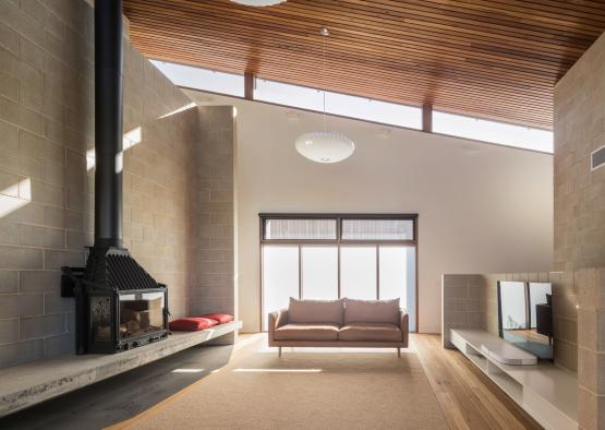 The tounge and groove flooring and continuous raked timber ceiling top and tail the room with the glow of wood. The timber boards run the width of the rooms, subtly increasing the feel of the room size, and ingraining a traditional beach house aesthetic. Offcuts of the timber flooring were used to fabricate timber grills for the recessed hydronic heating panels beneath the floor.