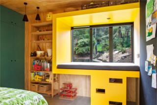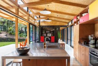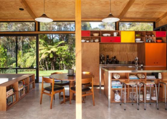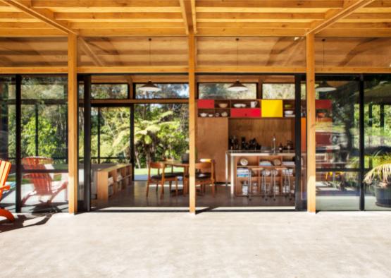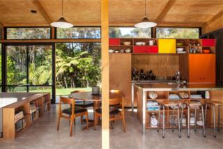 In essence, the rectangular form that incorporates the lounge, dining and kitchen zone is a glazed timber box. At only four-metres wide, it fits a great deal of living into a small footprint. Sandwiched between the bedroom blocks, its soaring mono-pitch roof is strung between the two, akin to a canvas tarpaulin.