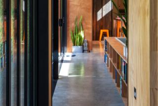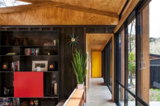 Off the kitchen, a set of cavity sliders demarcates a spare bedroom or office. Board-and-batten detailing on this insertion further defines this zone and brings the barn-like exterior detailing indoors.