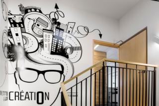 The building offers a stimulating work environment, with special attention given to natural lighting and outdoor views.