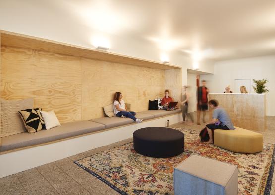 All joinery in the foyer space was fabricated out of plywood panels, including the daybed, bench seats, reception desk and the joinery unit behind the reception desk. The plywood finishes in the foyer set the scene for the material palette of the studios.