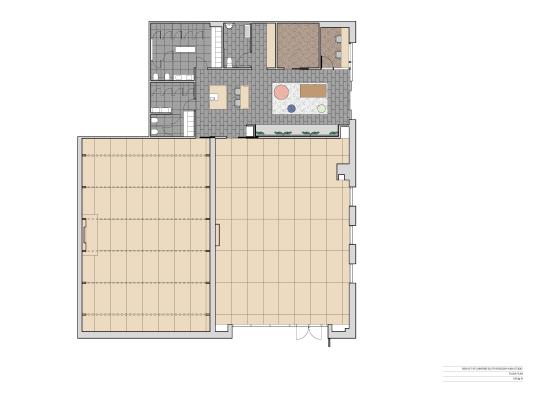 For the studio that was able to have windows, the intention was to keep the space light and bright, with more traditional white walls and ceiling. The floor was specified the same as the other studio, with an oiled plywood finish. A similar circular focal point was installed for this studio- an artwork named “The Reunion Angel” designed by an Australian artist, which we also backlit. The artwork was built into a plywood plinth that serves as the teachers podium.