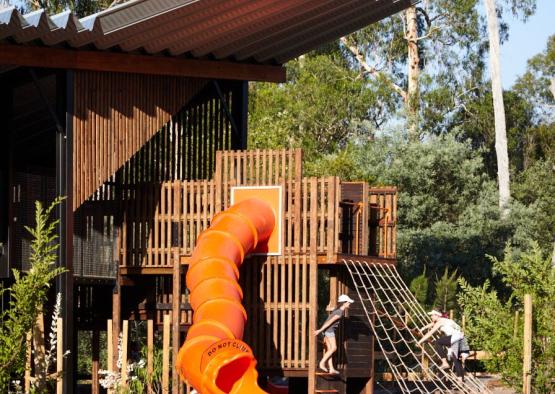 The recycled spotted gum makes up most of the structural elements, along with timber screens and balustrades, seating, raised platforms and play equipment.