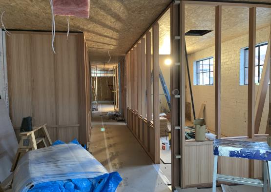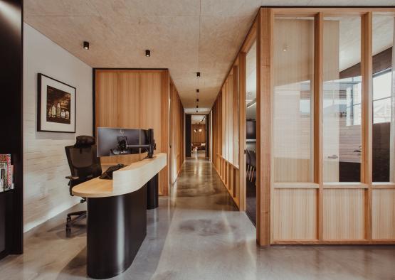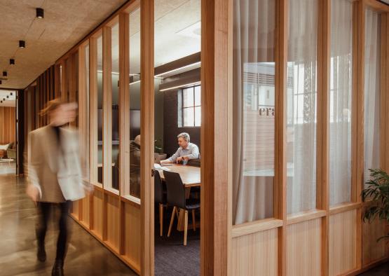 Solid timber framing and timber veneer panels were specified for the core of the office, and detailed in a way that was simple yet clever. The framing detail of the meeting rooms was built from solid Tasmanian Oak framing, veneer panelling, glazing panels, and a simple timber glazing bead which sets the glass into the timber frame. This choice nullified the need for a glazier or joiner on site, while allowing most of the joinery to be built at VOS’ offsite workshop — enabling quick installation and minimising the cost of labour.