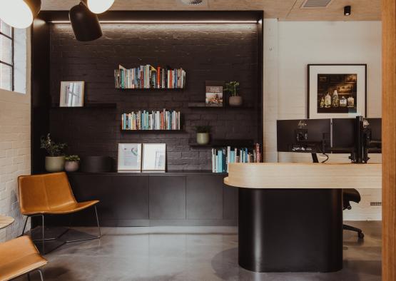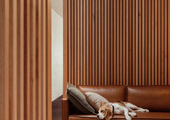 The inviting nature of the office begins at the reception desk, made from solid Tasmanian Oak and curved Tasmanian Oak veneer on a black cold-form laminex frame. The desk flows into the batten design, spanning the entire core of the office. Along the meeting rooms, the battens expand, framing the long internal windows and creating a sense of space that services open collaboration. The battens rhythmically contract as they progress through the space, concealing amenities and storage, and calmly wrapping the relaxation area at the centre of the office.