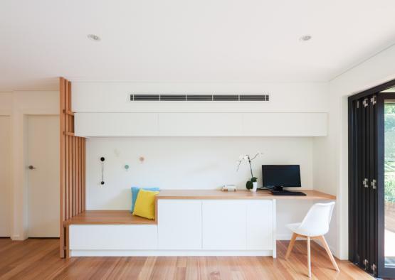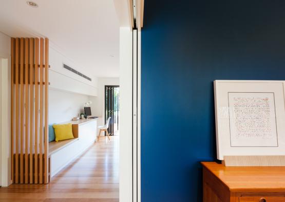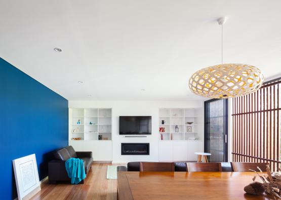 The timber was selected to act as a significant visual reference point in the house, which worked with white walls and joinery to provide a simple clean aesthetic, combined with pops of colour such as the teal wall in the living room. This timber was also selected for its homogenous appearance, bringing unity to the house interiors.
