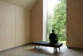 Every opening through the CLT reveals its thickness, with handcrafted chamfers to the edges delineating each panel. CLT is also used to create a contemporary version of a ‘cabinet of curiosities’, acting as an introduction to the collection, the village and its history.