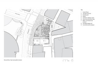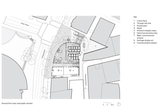 The ground floor of the new building, as well as the kiosk and public space, is formed in stone which curves and folds to create steps, and displays the site’s archaeological findings from Sydney’s colonial and Victorian-era. Carved into the sandstone core at the centre of the building is an extraordinary artwork by Aboriginal artist Judy Watson which interprets the rich cultural history of the site.
