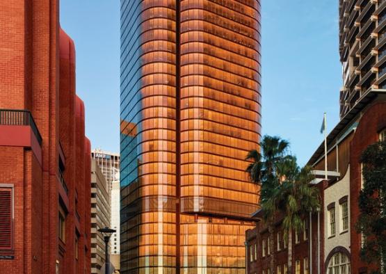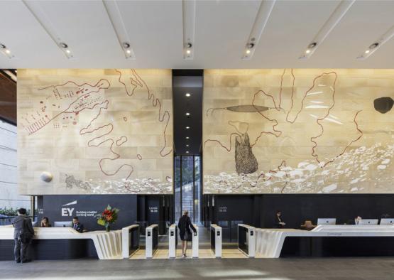 Positioned at the edge of Sydney’s Tank-Stream, the EY Centre was envisaged as a different type of city tower; warm, human and responsive, designed in order to create a healthy and sustainable workplace. fjmt were inspired by the sandstone of the old shoreline, and sought to create a tower that felt like an organic interpretation of the site, reinforcing the unique sense of place. To this end, the yellow block sandstone upon which Sydney is built was quarried to clad the core of the new tower.