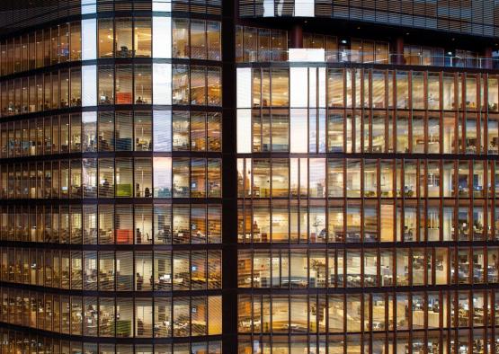 The facade of the tower is comprised of multiple layers. The outer layer is made from a single sheet of low iron clear glass, behind which is a layer of automated louvres of natural timber, located within a sealed, air-pressured cavity that is clean and dust tree. The result is a clear transparent sheen that offsets the natural glow of the wood, setting the tower apart from the grey glass buildings surrounding it. The progressively adjusting timber screen automatically responds to the position of the sun and the time of day, controlling heat load and sky glare, and filters the light into a warm timber glow that reaches deep into the interior.
