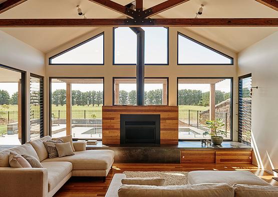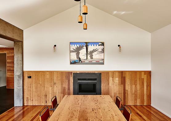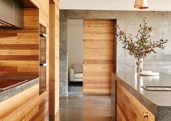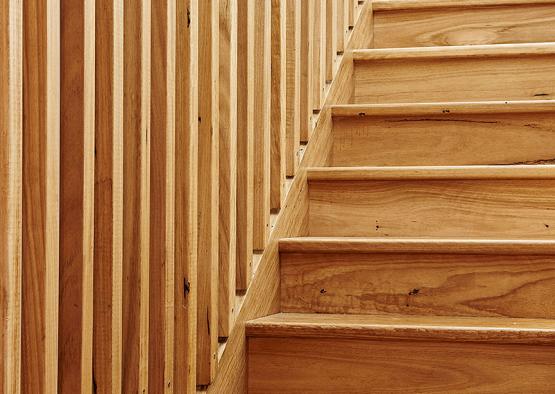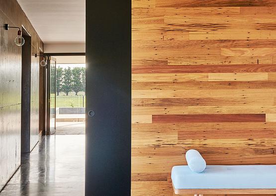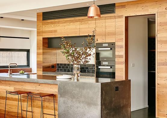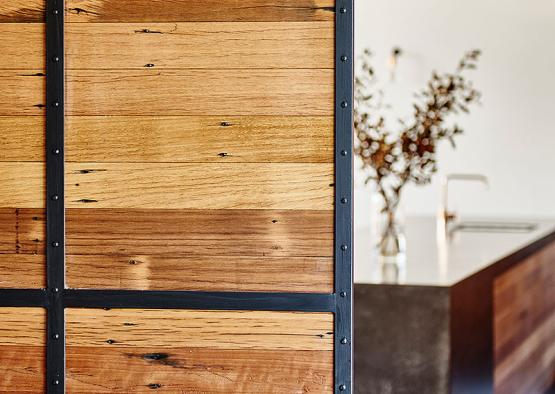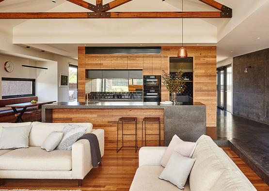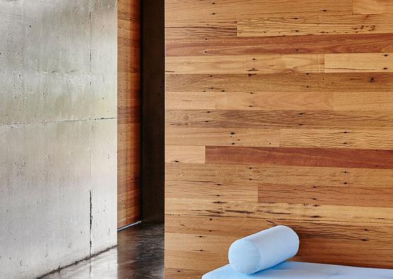 The key products include double black concrete floor and wall; recycled blackbutt from Timber Zoo; and recycled spotted gum for the custom made timber trusses. These custom made timber trusses were made on site by carpenters using traditional methods and lifted into position by a crane.