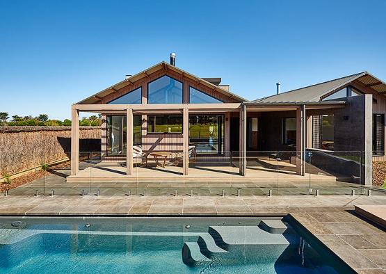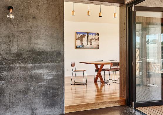 This two story residence is set on a coastal golf course estate in Barwon Heads. The clients were a family of five, including one avid golfer. The choice to feature concrete so prominently stems from the family's work in the concrete industry; the clients wanted to use as much of this natural material as possible.