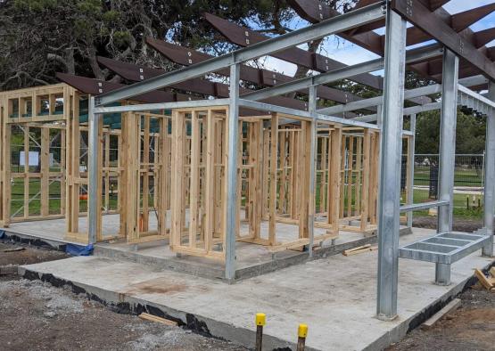 MGP10 stress graded timber wall studs were selected as the framing members. Using timber over steel studs in this environment was a conscious choice, as the timber copes with being hosed down daily by the council cleaning unit.