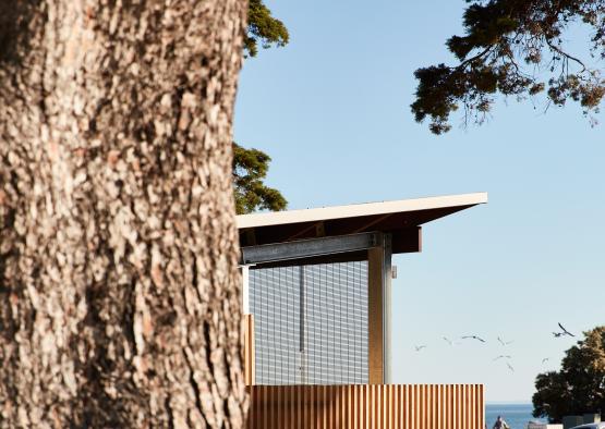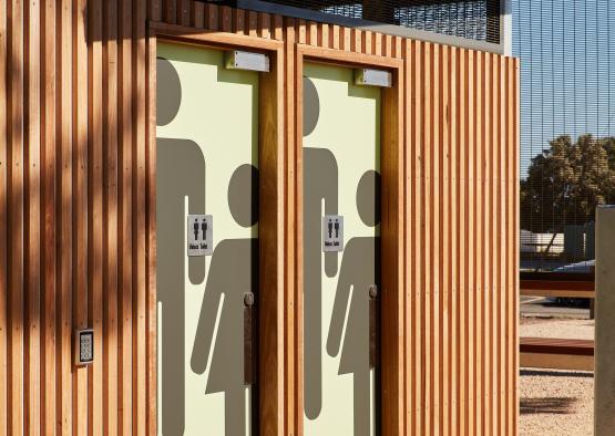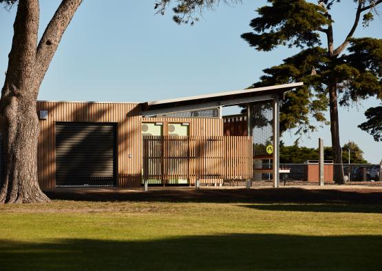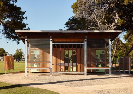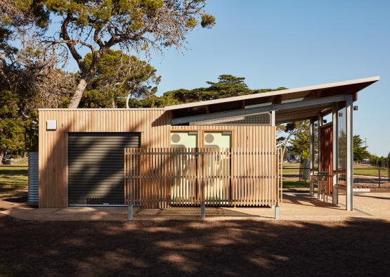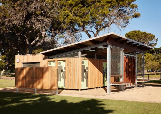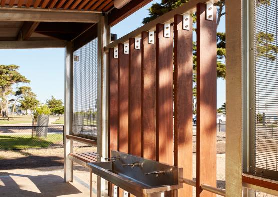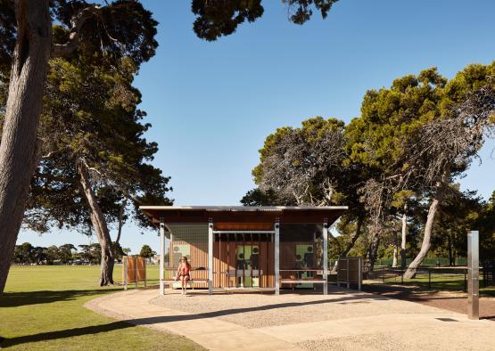 The amenities block sits opposite the Williamstown beach, under large Cypress trees in a sports field, next to a Botanic Garden. The design challenge was creating a public toilet facility that was embracing and comfortable, challenging the notion of toilet blocks as undesirable public facilities.