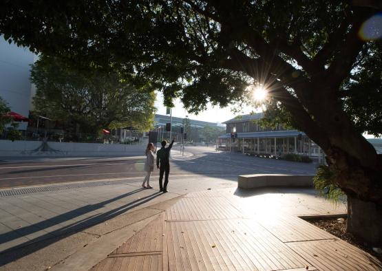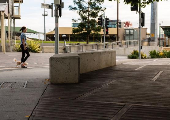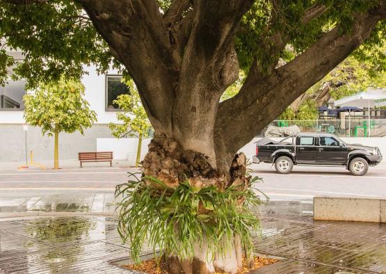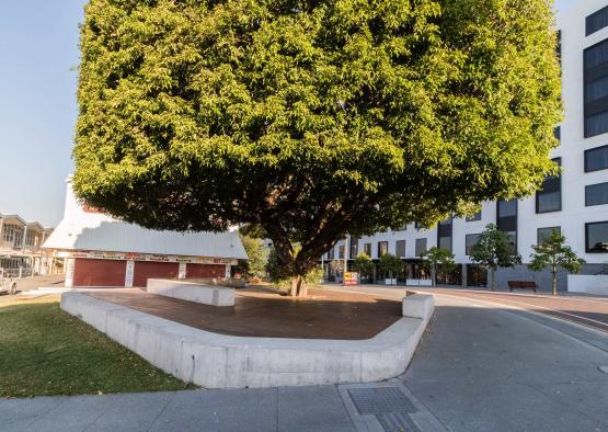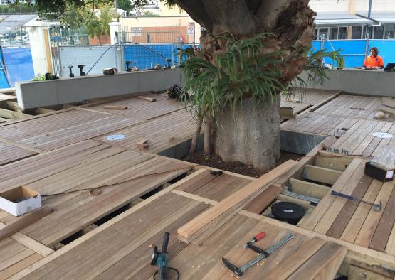 The ultrasound of the root system indicated that a random framing solution was required. The platform over the root system needed to be accessible for servicing of irrigation, and horticultural maintenance. A shallow change of height between the King Street pavement and the existing rootball meant that decking boards and joists had to be supported between bearers, which are expressed through to the surface. Dressed bearers were revealed to frame a checker board pattern of decking access panels. This alternate framing was employed to compress depth of framing so that decking surface finished flush to King Street pavement while providing servicing space below.