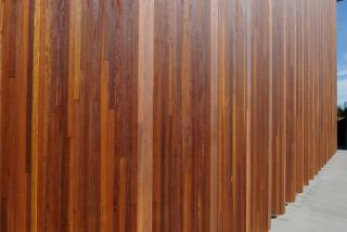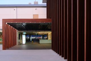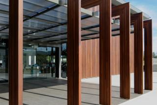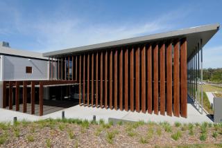 The Centre's external facade is nine metres in height. Graphite Architects wanted a single, solid element that would span both floors and specified striking timber blades reaching the building's full height as a fundamental feature of the design.