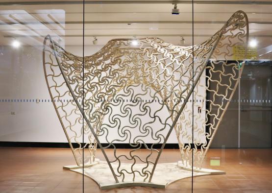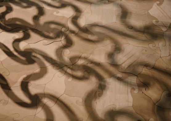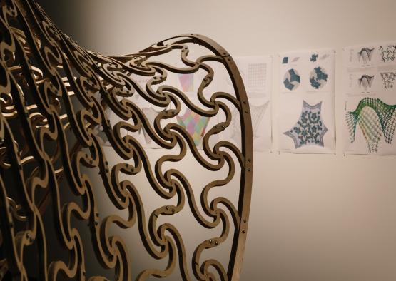 FlexMap 2 is a doubly-curved bending-active structure made from flat 2D spiral panels. The panels were CNC cut out of 15mm thick plywood sheets. The mechanical properties of each panel are locally tuned by varying the shape of its spiral. The resulting panels perform as variable stiffness elements. Once assembled together, each smaller piece helps to form the overall geometry of the designed structure