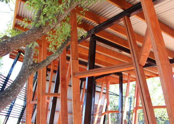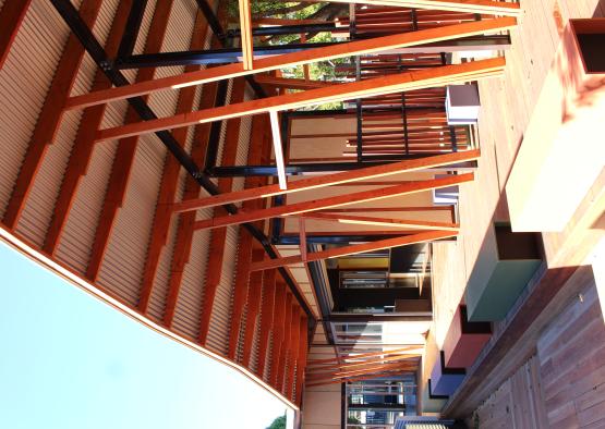 LVL bearers, joists, studs and roof beams were used for the reasons of strength, straightness, sustainability and ease of use. LVL was also used for construction of timber floors, support framing and roof structure. The framing is exposed where possible to show the complete structural function of the timber and the versatility of installation and connection details. The appearance of the timber was to project a rawness to the exposed structure.
