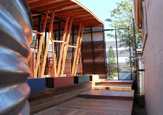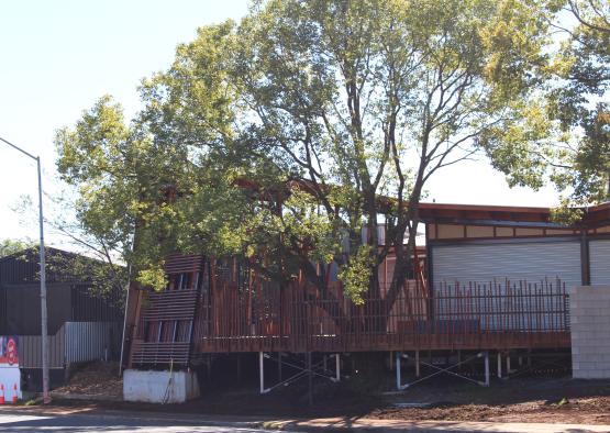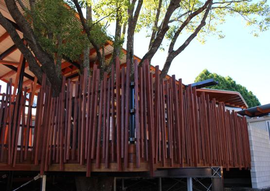 The fluid, stripped back timber form resolutely reflects the use of this building as a collection of spaces for mentoring activities between older adults and younger students. The whole premise of the concept is about people sitting out under a tree having a chat. What better way to emulate that experience than to use a natural material like timber with its warmth and natural characteristics. We have constructed a virtual tree canopy by utilising the versatility of timber studs and framing to form a forest of trunks and branches supporting the roof canopy. This warmth of materiality has been carried through to the flooring and balustrading creating an effect of sitting within nature. Although a formalised environment, there is a feeling of not being within the confines of a building. In a way, it is a non-building for the most part which has only been possible to create using timber materials in a non-traditional way.